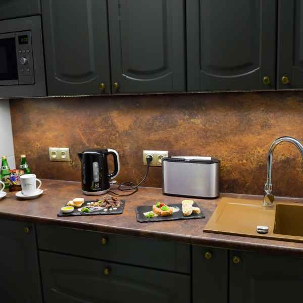 W apartamencie przygotowaliśmy aneks kuchenny z dostępem m.in. do mikrofalówki, lodówki, ekspresu do kawy i czajnika elektrycznego. Tutaj znajdziecie też Państwo deskę do prasowania i żelazko.